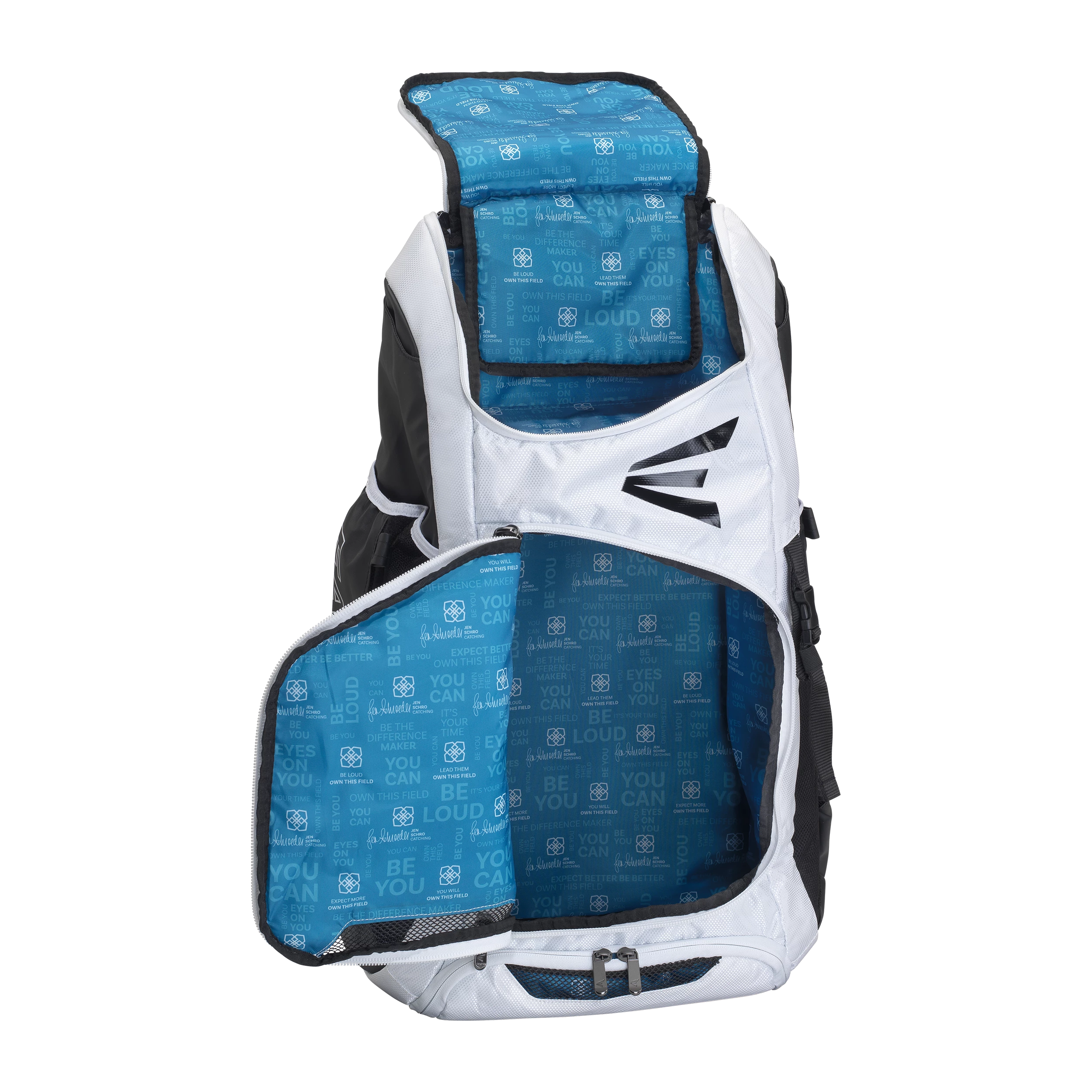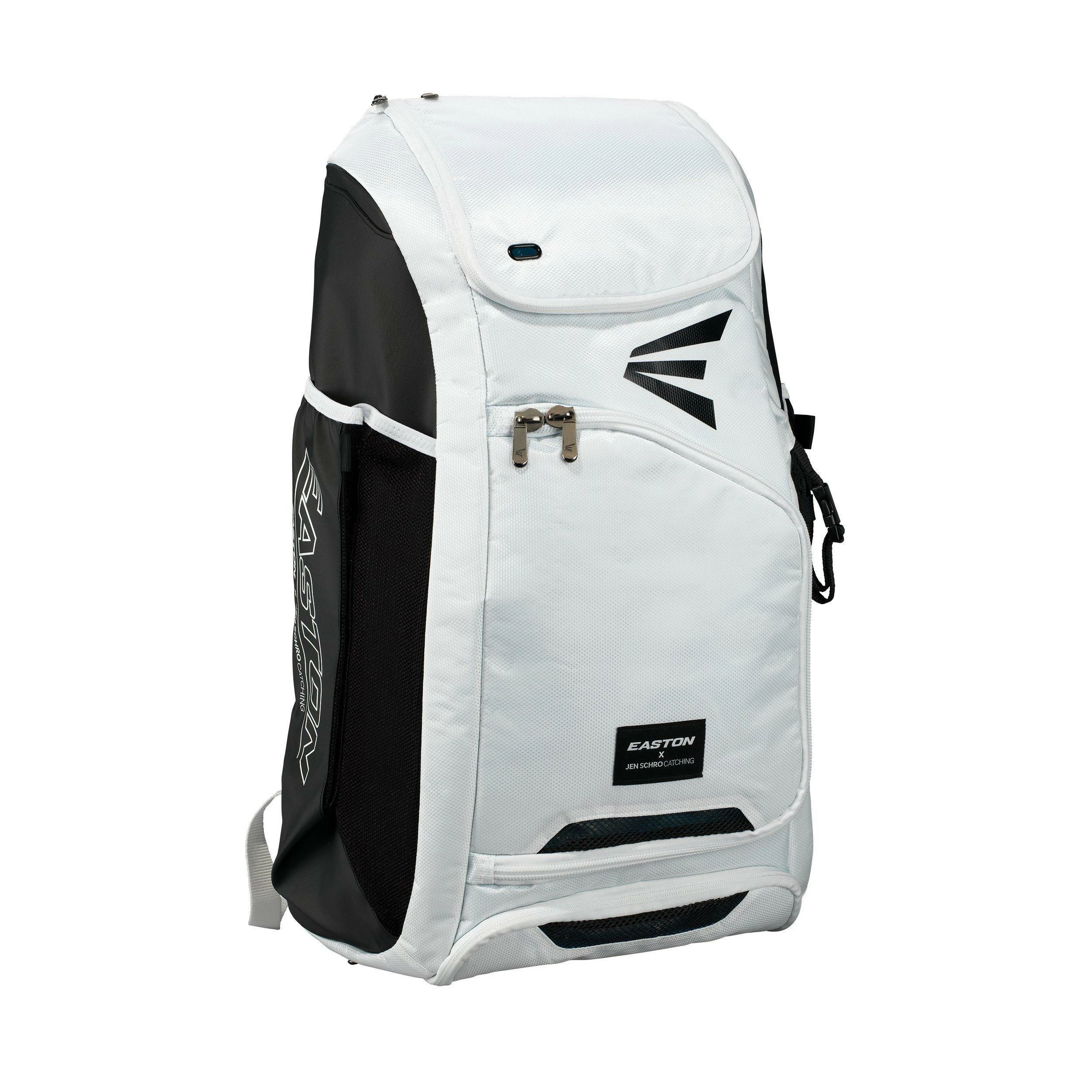 Easton’s Jen Schro Catcher’s Backpack was built to hold all of your catcher’s gear and all of the necessities for a day at the field. Designed in collaboration with Jen Schro, this backpack features a large vented main compartment to fit a full set of catcher’s gear, an interior shelf to keep gear organized, as well as a separate vented shoe compartment. The bag also features Jen’s inspirational messaging throughout the interior lining and Easton X Jen Schro Catching Lockup on the outside. Side mesh sleeves hold leg guards when in tow, and can be folded and secured out of the way when not in use. The external strap and buckle on the front are ideal for attaching your ball glove or batting helmet. Since we know you’re so much more than just a catcher, the bag also features two fully-lined bat sleeves.