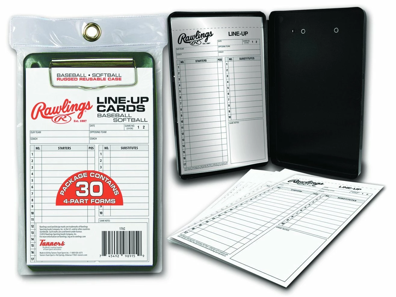 Rugged black plastic case comes with 30, 4 part system 17 line up cards. Convenient clip holds form on outside of box, and a handy place to keep the cards during games.